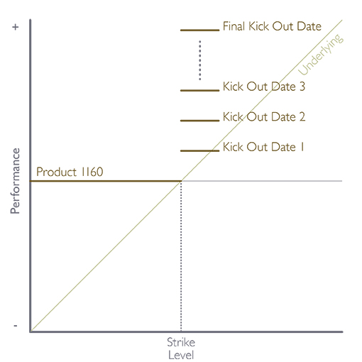 | Return Calculation | The performance of the Underlying is measured on set dates ('kick out dates') during the term. A fixed return is paid and the product matures on the first of these dates that the Underlying meets a pre-specified condition (for example, it closes at or above a certain level). The fixed return on offer usually increases for each subsequent kick out date. |